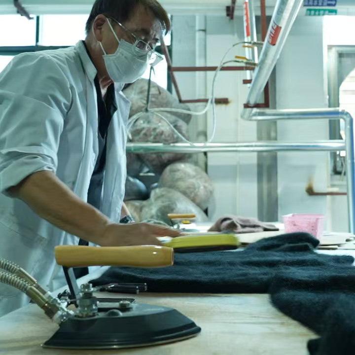 Yoshinobu Ishikawaは、ニット製品の管理、生産、技術開発において40年以上の経験を持ち、特にカシミヤやウールの洗浄およびフェルト化技術において卓越した技術を有しています。過去20年間、彼は独自のブラッシング技術とアンチピリング処理技術を磨き上げ、これによりDORAVIIEでは柔らかさと耐久性を兼ね備えた、世界でも最高品質といえるカシミヤを提供しています。